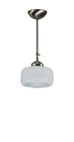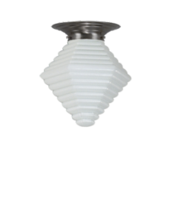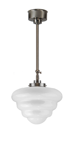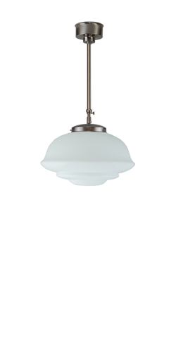Alle Dinerlampen und Art Deco Leuchten sind als Deckenleuchte oder mit einem in der Höhe verstellbaren verchromten Deckenpendel als Deckenhängeleuchte lieferbar. Ein verchromter Baldachin für die Decke ist auch dabei.